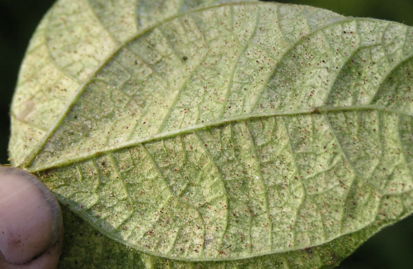 発生初期には、葉の主脈と太い葉脈の周りに黄色がかった小さな白い斑点が現れます。次第に斑点が増えてつながり大きくなると、空洞になった細胞のエリアが白や透明な銀色に見えます。